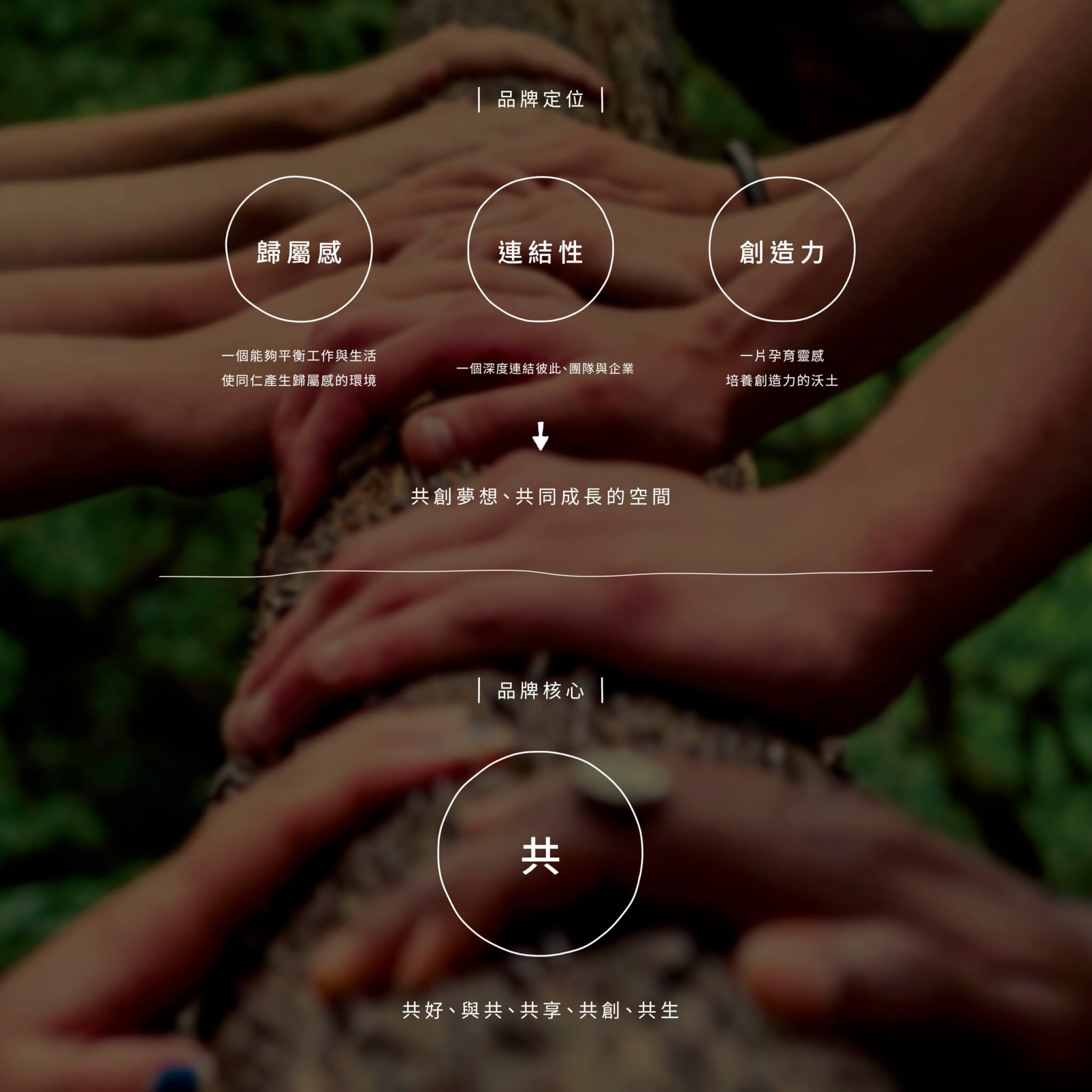 我們以「人與自然的連結」為發展基礎,將「共創」的意象融入標誌,強調人與人之間的「連結」感;同時,透過山形輪廓與三角框的幾何線條,象徵人們的「凝聚」,傳遞此空間如家般的「歸屬」感。整體設計如同一棵大樹寓意著自然包容並呵護在此活動的我們,而我們也將回饋大地,持續與自然共創連結。