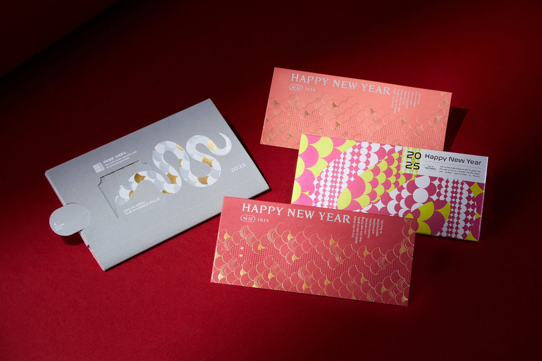 Inside, three red envelopes extend the snake-scale visual language, each expressed through a distinct color palette to reflect our vision for 2025. Red tones paired with gold foil convey warmth and blessings, while bold, vivid patterns point toward breakthrough, creativity, and the unknown. The gesture of blessing moves beyond form and becomes an energy that carries into the year ahead.