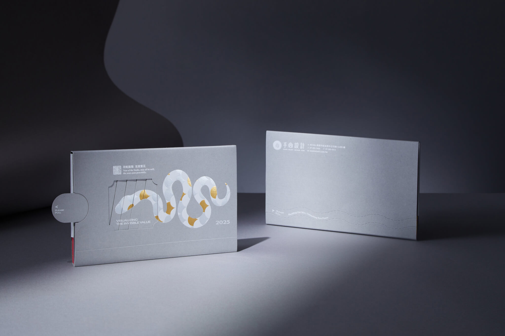 回望 2025 年,手心的新年賀卡以「蛇」作為核心意象,透過賀卡卡套的抽拉互動設計,描繪蛇脫皮、蛻變的過程;層層推進的蛇紋變化,也映照著手心在那一年裡,面對挑戰、不斷拆解與重組自我的狀態。