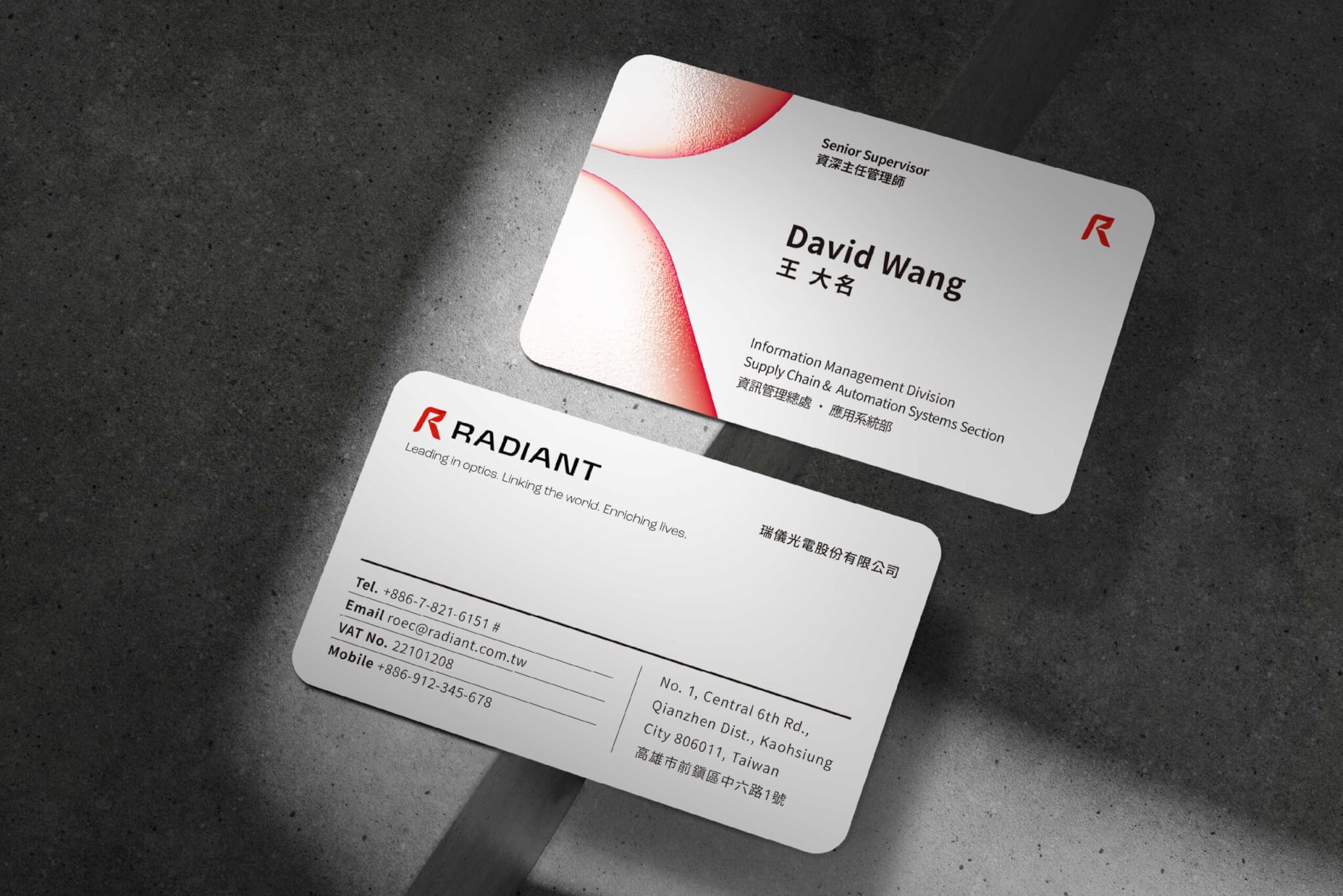 為對應多元的應用場景,我們重新詮釋光線折射、聚焦等運動軌跡 ,創造一套具流動性的輔助圖形系統應用於簡報、名片及企業信紙等各項品項 ,建立一致性的同時 也展現瑞儀光電作為國際企業的專業及信賴感。